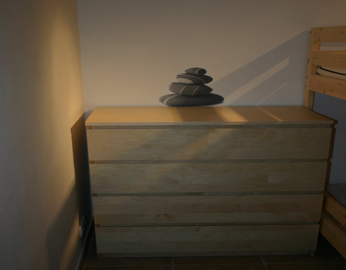 6 couchages sont disponibles (1 chambre avec lit double, 1 chambre avec lits superposés et 1 clic clac dans le salon).